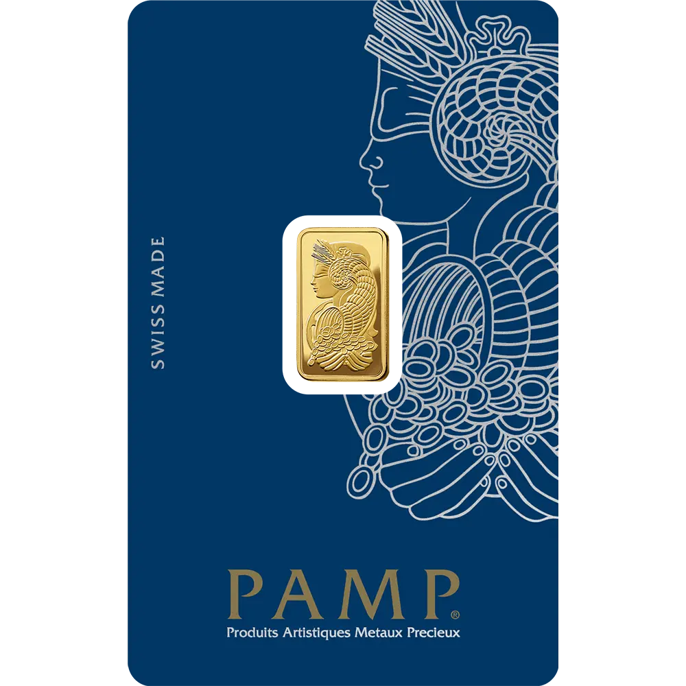 NEW Fortuna Gold Rectangular Ingot - 2.5g Discover the elegance and craftsmanship of the PAMP Fortuna Gold Rectangular Ingot - 1g. This ingot features PAMP’s distinctive Lady Fortuna design, the first decorative motif ever to grace a precious metal bar. Globally recognized as a symbol of quality and authenticity, it depicts the Roman goddess of prosperity with all her mythical attributes, including sheaves of wheat, poppies, a Horn of Plenty, precious coins, and the Wheel of Fortune. Ensure the authenticity of your investment with PAMP's advanced VERISCAN™ Bullion Identification Security System.